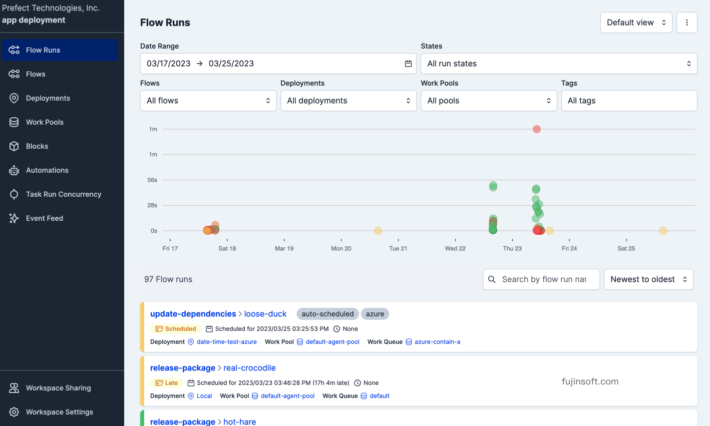 可视化界面:Prefect提供了一个直观的Web界面,用于可视化工作流的结构和执行情况。您可以通过界面查看工作流的整体结构,监控任务的运行状态和历史记录,并在需要时进行干预和调整。